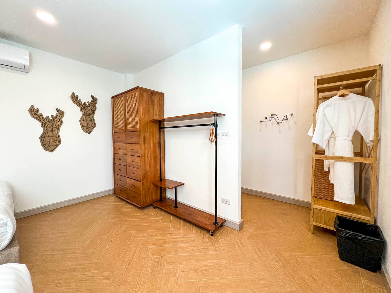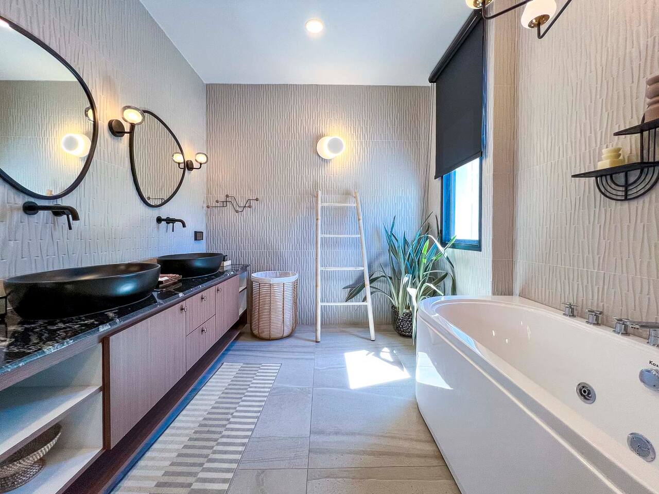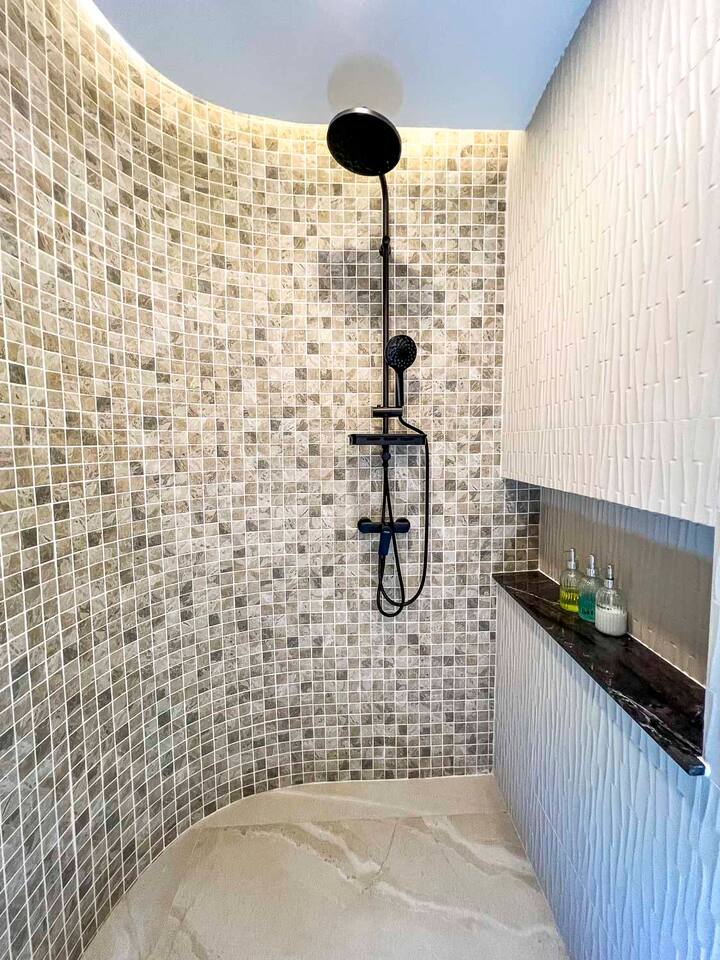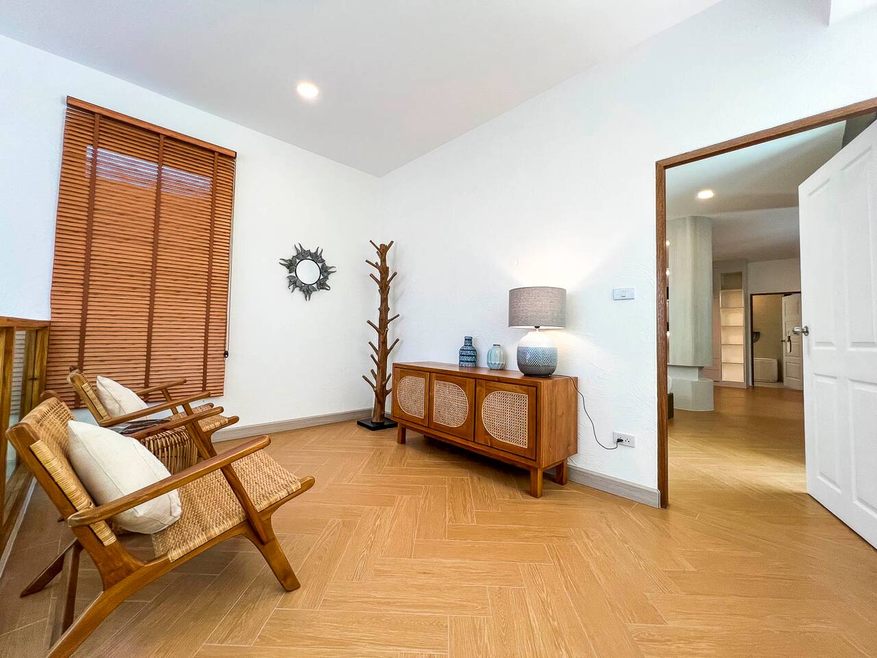 This is a modern 2 storey villa, rooftop with Doi Suthep Views, and a large swimming pool with jacuzzis. ⁃ 7 Bedrooms ⁃ 8 bathrooms ⁃ Large common area ⁃ Western kitchen with appliances ⁃ Large TV with conversation pit ⁃ Large wrap-around pool deck This villa can host up to 20 people with facilities to keeo everyone entertained. It is the ideal house for family vacations, business groups, and large group of friends. The 7 bedrooms and 8 bathrooms ensures that all guests have their privacy. The light interior, blended with wooden furnitures create a warm and homey environment. The common area opens up to the pool deck which is spacious and a nice hangout spot. The pool is a salt-water pool with a jaccuzi and a perfect size for both adults and kids. The gate is remote controlled and surrounding walls of the property are constructed high to ensure our guests ultimate privacy.